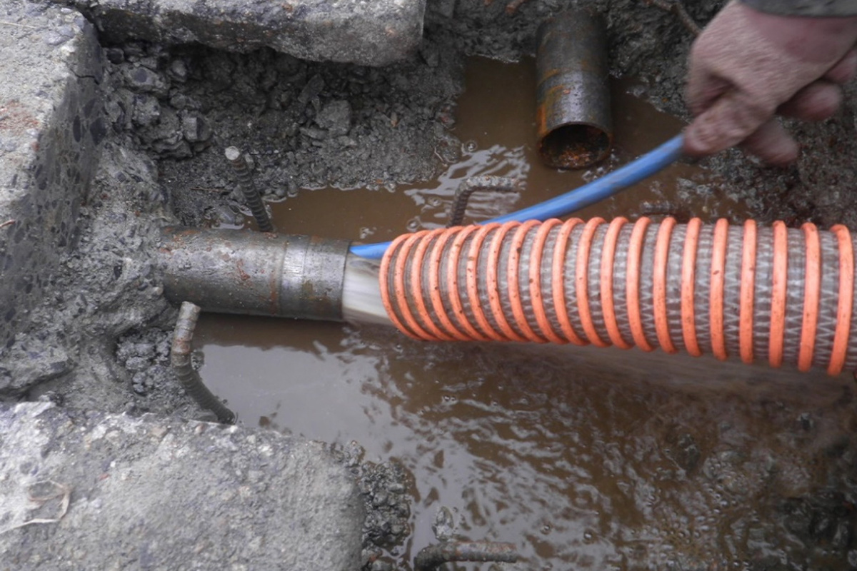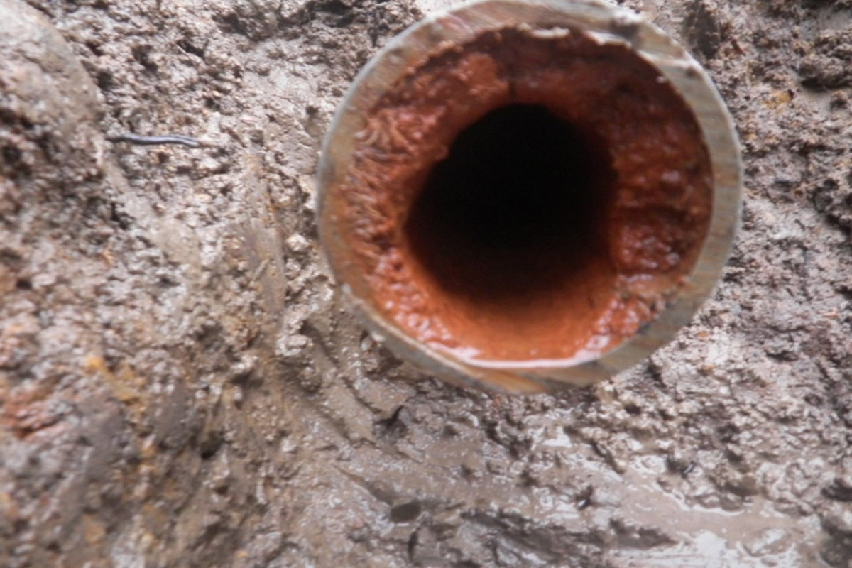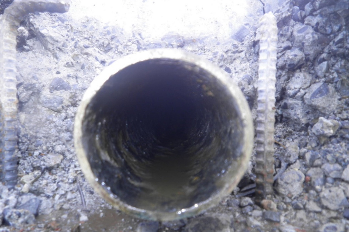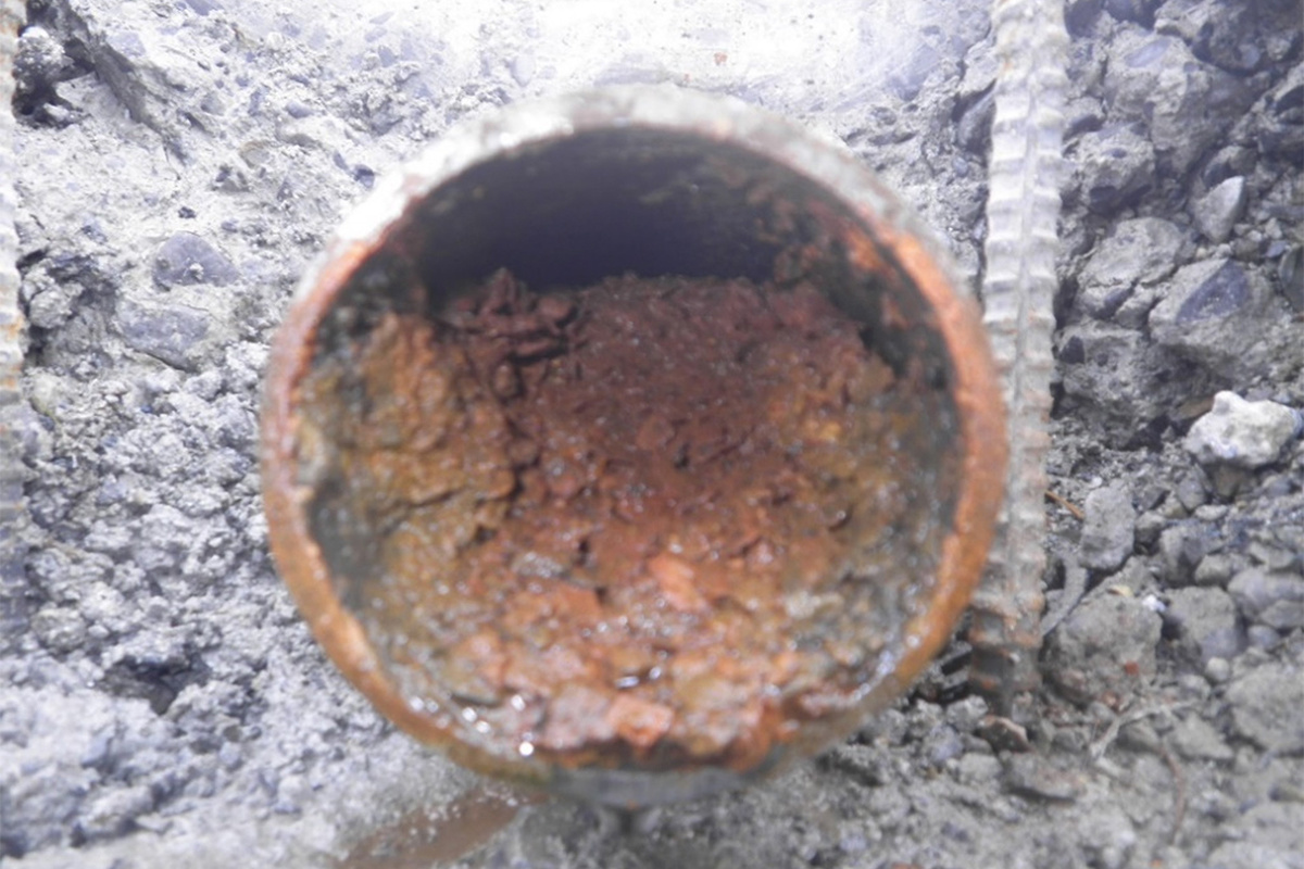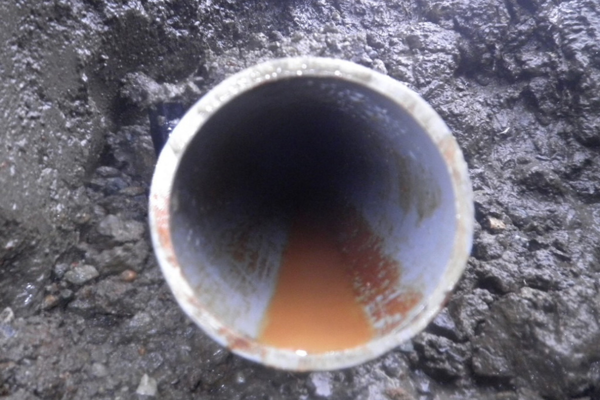 消雪パイプ清掃前(パイプ内に錆がたまっています)