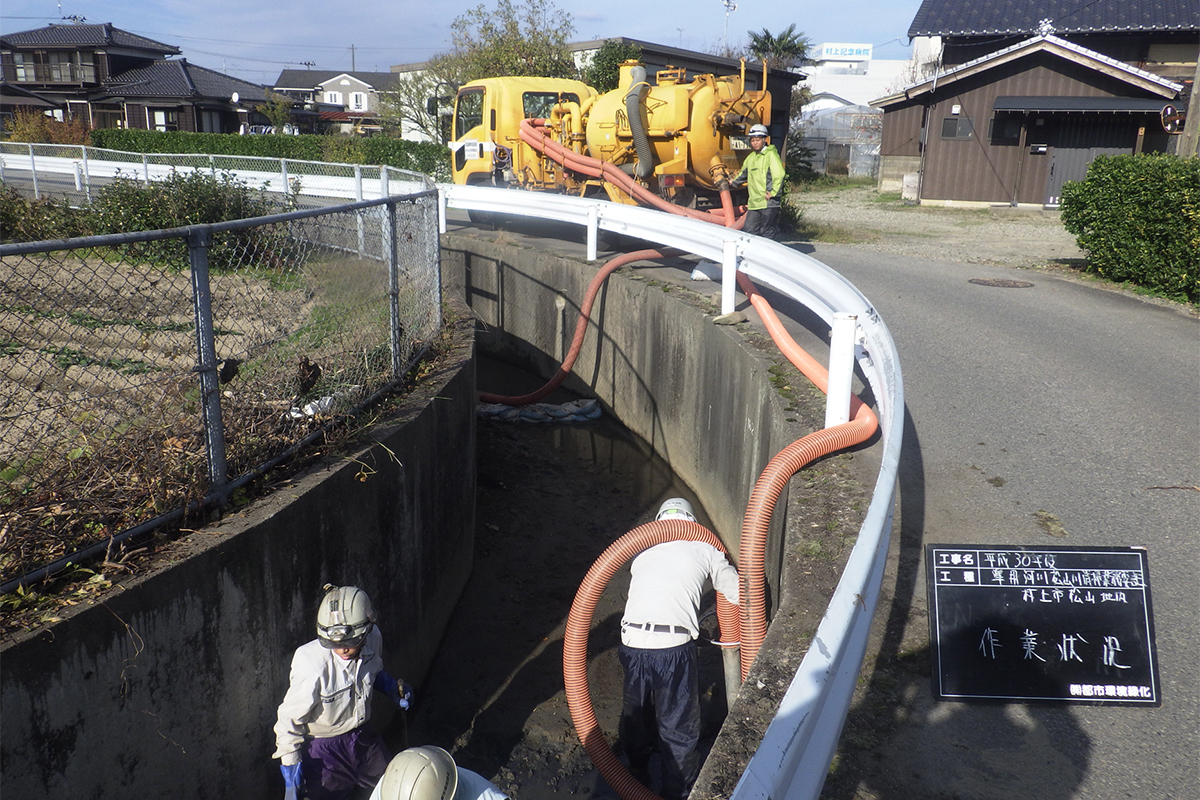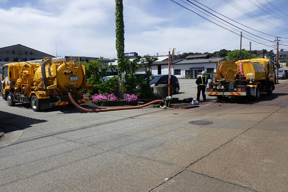 住民の皆様の快適な生活環境を維持するため、強力吸引車や高圧洗浄車、TVカメラ車などの特殊車両を利用し、下水道インフラの維持管理業務を行っています。